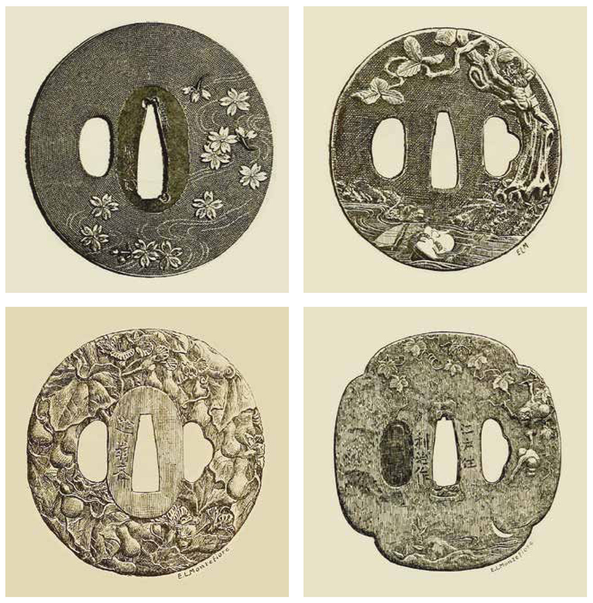 Édouard ed Emma frequentavano gli stessi japonistes amici di Louise79Cernuschi, Burty, Taigny, Ephrussi e Gonse.. Raoul Montefiore, figlio di Édouard, scrive: “Mio padre fu uno dei primi ad apprezzare l’arte giapponese. Con Gonse, Burty e Czernusky [sic.] ne comprese la finezza. La sua collezione era molto conosciuta. Di tanto in tanto lo vedevamo tornare con un nuovo oggetto che aveva appena comprato e mia madre alzava gli occhi al cielo. Ho così conosciuto le delicate statuine in avorio, ognuna delle quali raccontava una storia, le scatole dei medicinali in lacca, le sciabole con il fodero in lacca. Una di queste lame di sciabola aveva 1.000 anni e valeva 10.000 franchi”80Raoul Montefiore, Souvenirs (1872–1900), Paris, Chez l’auteur, 1957, p. 22 e pp. 76–77.. La ‘sciabola’ in questione era una katana di Ōhara Sanemori, un fabbro del IX secolo che fu tra i primi81Insieme al padre Yasutsuna Saburodayu (749–811). a realizzare le spade curve in Giappone82Gordon Warner, Japanese swordsmanship: technique and practice, New York, Weatherhill, 1991, p. 9.. Per Gonse la lama di Montefiore era la “più notevole” fra quelle conosciute, tra l’altro la spada era rifinita con una montatura (koshirae) realizzata da Gotō Ichijō (1791–1876), monaco buddista e più importante realizzatore di finiture di spade del XIX secolo83Louis Gonse, L’art japonais, op. cit., Tome II, p. 133. .