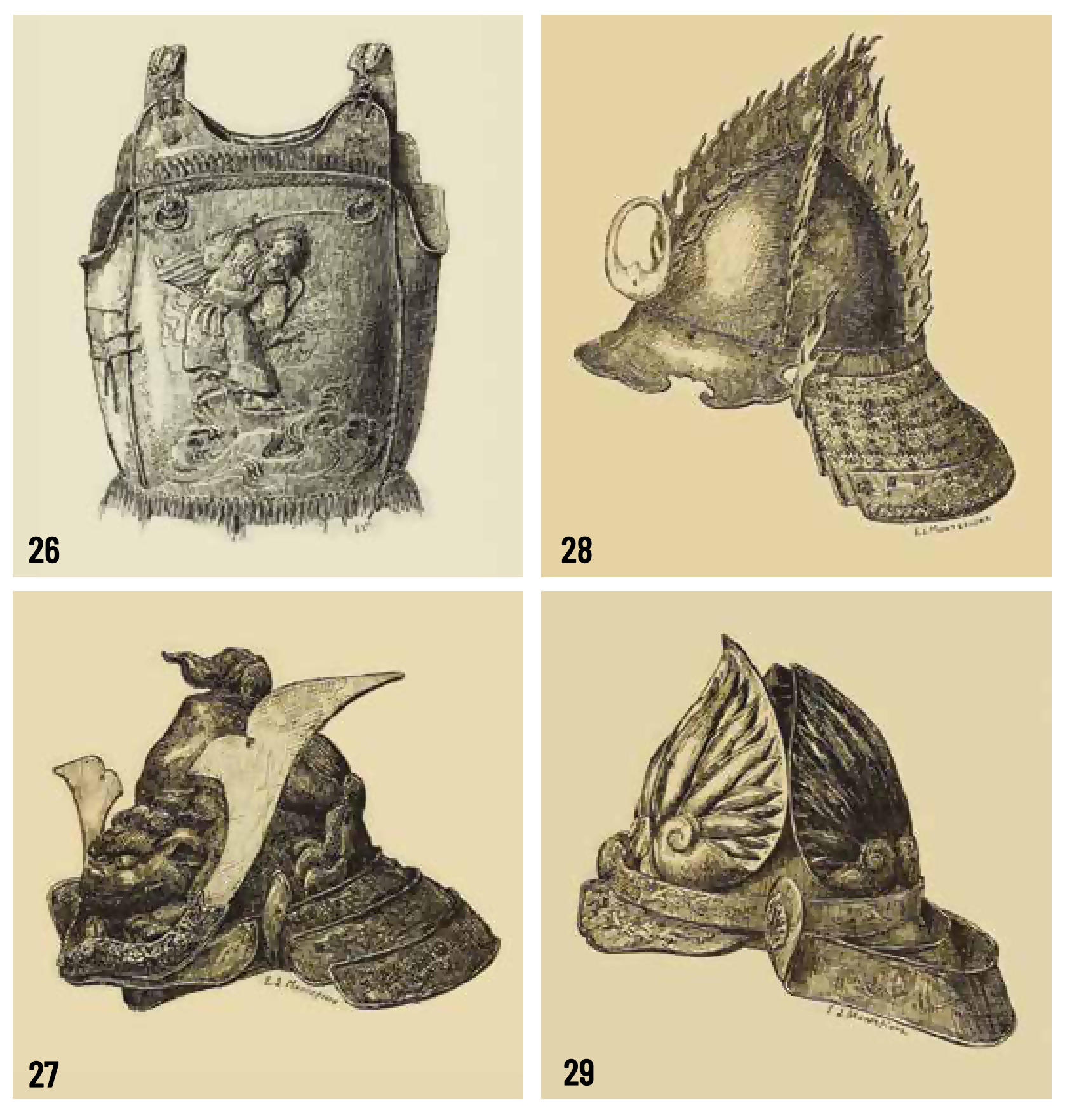Fig. 26 – Un pettorale per armatura giapponese della collezione Édouard Levi Montefiore. Fig. 27 – Un kabuto della collezione Édouard Levi Montefiore. Fig. 28 – Un kabuto della collezione Édouard Levi Montefiore. Fig. 29 – Un kabuto con lo stemma della famiglia Tokugawa della collezione Édouard Levi Montefiore.